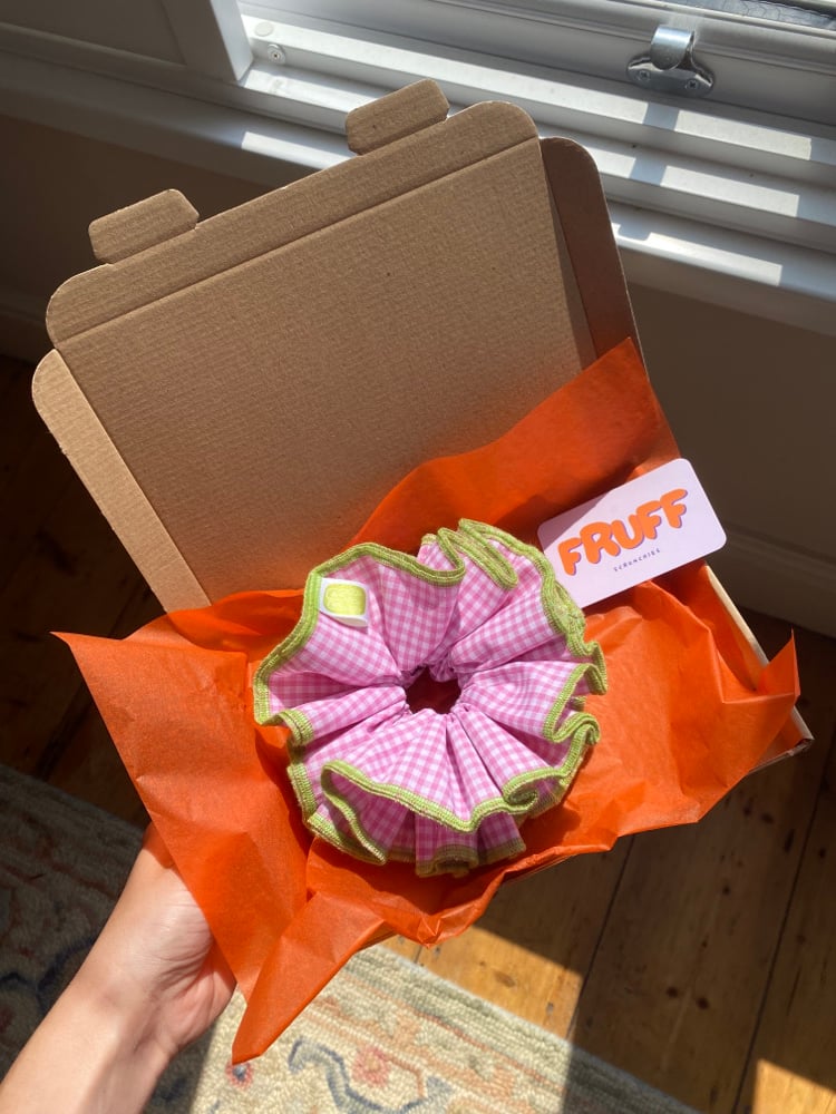 The cutest oversized scrunchie – handmade by me (Betsy) @ Fruff HQ (my dining room 😉).